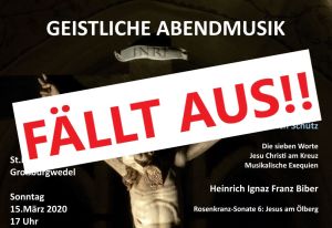 Die Geistliche Abendmusik am Sonntag, 15.03.2020 um 17 Uhr fällt aus. Ein Ersatztermin ist für den Buß- und Bettag geplant.
