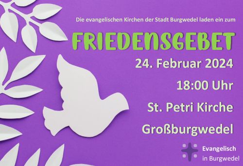 Die evangelischen Kirchengemeinden der Stadt Burgwedel laden zum Friedensgebet am Sa., 24.02.2024 um 18 Uhr in die St.-Petri-Kirche in Großburgwedel ein.
