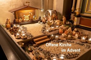 Nehmen Sie sich Zeit für eine stille Andacht oder einen Blick auf unsere schöne Weihnachtskrippe und den Adventskranz, der in diesem Jahr von Konfirmand*innen gebunden wurde.
