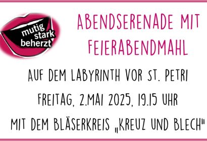 Kirchentag auch in St. Petri! Auf dem Labyrinth findet am Freitag, 02. Mai 2025, um 19:15 Uhr eine Abendserenade mit Feierabendmahl statt, die musikalisch von dem Bläserkreis "Kreuz und Blech" gestaltet wird. Im Anschluss: Gemütliches Beisammensein bei Bratwurst und kühlem Getränk. Herzliche Einladung!!