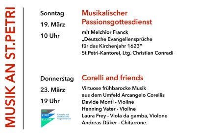 Am Sonntag Laetare laden wir um 10 Uhr zu einem musikalischen Passionsgottesdienst ein. Die St.Petri-Kantorei (Leitung Kreiskantor Christian Conradi) singt fünf Motetten aus dem Zyklus „Deutsche Evangeliensprüche für das Jahr 1623" von Melchior Franck