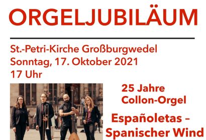 Das 25-jährige Orgeljubiläum der Collon-Orgel in St. Petri feiern wir mit drei Veranstaltungen. Am 17.10. um 17 Uhr zeigt sich die Nähe unserer Collon-Orgel zur spanischen Barockmusik, „Españoletas – Spanischer Wind“ mit dem Ensemble Concierto Ibérico