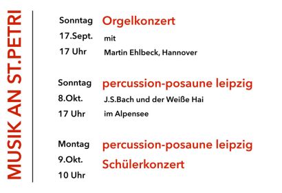 Nach der Sommerpause startet unsere Konzertreihe an St. Petri mit einem Orgelkonzert. Martin Ehlbeck, Hannover, spielt Werke von Buxtehude, Sweelinck, du Mage, Spaulding Stoughton, Piazzolla und Gigout