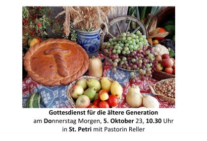 Ein Gottesdienst zum Erntedank für die ältere Generation - am Donnerstag, 05.10.2023 um 10:30 Uhr in St. Petri mit Pastorin Bodil Reller.